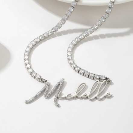 This Mica Crystal Tennis Necklace adds a personalized touch to your everyday look. Made with durable stainless steel and adorned with sparkling CZ stones, it's perfect for any occasion. Easily customize with your name for a unique touch. Elevate your style with this stunning necklace.